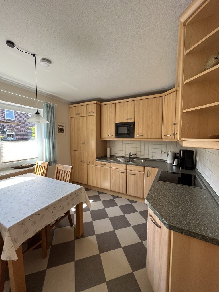 In der separaten Einbauküche mit Herd, Backofen, Spülmaschine, Kühlschrank, Toaster, Kaffeemaschine, Mikrowelle und Wasserkocher befindet sich ein Esstisch mit Stühlen.